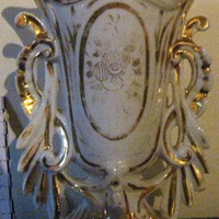 - Floreiro en forma de ánfora, tipo Imperio, en porcelana fina branca salpicada con pinceladas en dourado; nos laterais, dúas asas formando grilandas vexetais trenzadas con motivos de rocalla. Sobre pé circular exvasado e moldurado. O corpo, lotiforme, vai decorado cunha flor pentapétala orlada con motivos vexetais, todo en tons dourados.