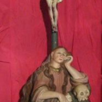 - Imaxe de María Madanela penitente aos pés de Xesús Crucificado. Madeira policromada.