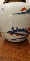 - Xarrón globular de colo corto, feito en porcelana, con tapadeira con pechadura en bronce. Policromado, representa unha paisaxe xaponesa en tons azuis e fondo branco.