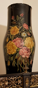 - Xarrón de corpo cílindrico e éntase no galbo, en cristal lacado en negro e decorado cun ramo de rosas, de cor rosa e amarela, e margaridas.