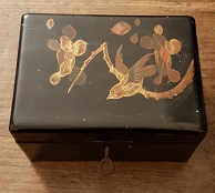 - Caixa en madeira lacada en cor negro. Na tapadeira un paxaro e motivos vexetais en dourado. Tamén ten chaves.