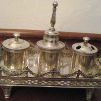 - Tinteiro en prata de corpo cilíndrico decorado no imóscapo e sumóscapo con cadansúa cenefa de motivos xeométricos. Tampa en forma de media laranxa moi rebaixada, con cenefa repuxada de láureas dispostas en grilanda, arista concéntrica e botón no remate. Na mesma tapa, o punzón cordobés: león rampante con cola eseada nun cartucho ovoide. Do prateiro cordobés Castejón, marcada polo contraste Torre (véxase a peza 473)