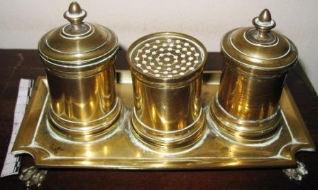 - Bandexa para escribanía de planta rectangular coas esquinas cortadas en chafrán. No plano, conta cos tres ocos para acomod do tinteiro, salvadeira e portaplumas. Vai apoiada en catro pés en forma de garra, e un pequeno orificio na parte traseira para colocar a pluma.