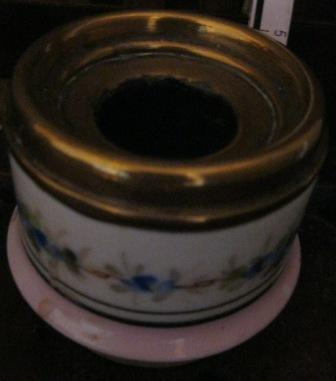 - Portaplumas en porcelana de cor rosa, corpo cilíndrico percorrido con motivos florais a pincel. Borde superior en bronce. Da casa de Amable Dubourget, fabricante parisino de escribanías.
