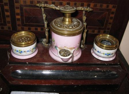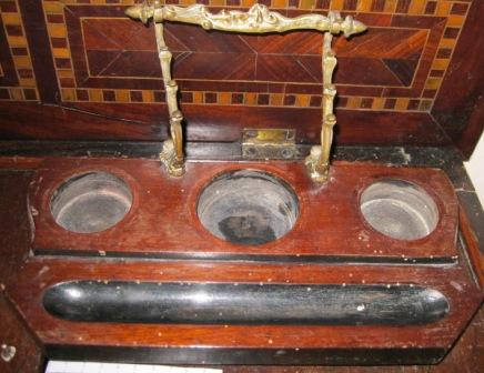 - Bandexa de escribanía en madeira con tres ocos redondos que serven para colocar o tinteiro, o portaplumas e a salvadeira; soporte en bronce para colocar tres plumas. Da casa de Amable Dubourget, fabricante parisino de escribanías.