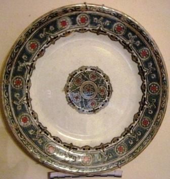 - Prato chan en louza de pedernal, de cor branco con cenefa e na parte central con debuxos xeométrico florais semellando traballo de musivaria en tons verdes, negros e dourados.