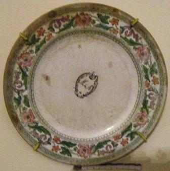 - Prato chan en louza inglesa, de cor branco con cenefa con motivos florais e xeométricos en tons verdes e rosas; no centro debuxado a plumilla por D. Benxamín de Prado as iniciais M.A ( María de Andrés).