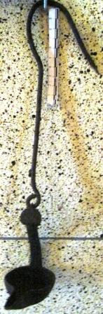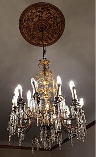 Lámpada de teito con cinco brazos en bronce, con catro candeas para cada brazo e lágrimas prismáticas, facetadas, de cristal. Antigamente era de candeas e foi adaptada posteriormente á electricidade.