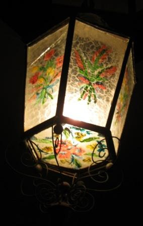 Lámpada de teito en cristal con relevo de cor laranxa. Parte superior en ferro e suxeita tamén con cadeas de ferro o teito. Antigamente esta lámpada era de gas.
