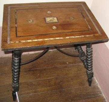 Mesa de noite con taboleiro en marquetería de marfil e óso, e motivo decorativo no emblema central dun paxaro, quizais un melro, tamén en marfil, acompañado por trísceles de catro aspas no mesmo material. Catro patas en madeira torneada de cerdeira, de perfil lenticular, con fiadores de perfil eseado en ferro forxado. Probabelmente fora o soporte dun contador ou bargueño.