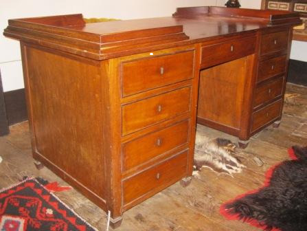 Mesa de despacho en madeira de caoba, coa parte central oca e catro caixóns a cada lateral e unha parte central. Por outro lado, unha lacena en cada lateral cun caixón na parte superior e na central tamén oco cun caixón na parte superior.