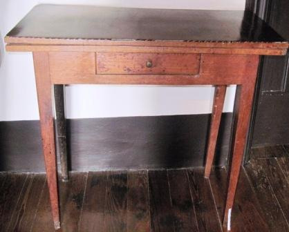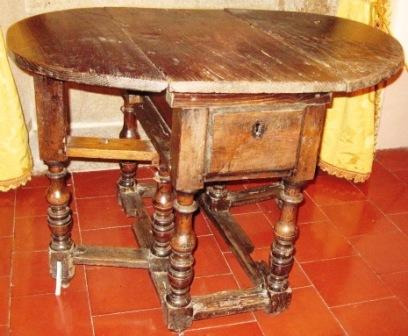 Mesa de comedor ou refectorio en madeira de castiñeiro, tallada con motivos xeométricos e floróns tetrapétalos de valor apotropaico. No amplo faldón, triple caixoneira con cartucho central de perfil convexo e tiradores de ferro en forma de perno. Vai apoiada en catro patas molduradas, en forma de estípite e unidas con chambrana.