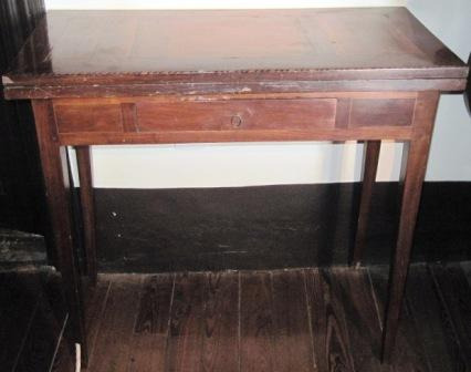 Mesa de xogos con tapa abatible. Aberta, un taboleiro de xogo de cartas en madeira de caoba con incrustacións de marquetería que forman rosas dos ventos. Caixón frontal. Apoiada en catro patas afusadas, unha delas abatible (que se abre para suxeitar o taboleiro cando a tapa está aberta)