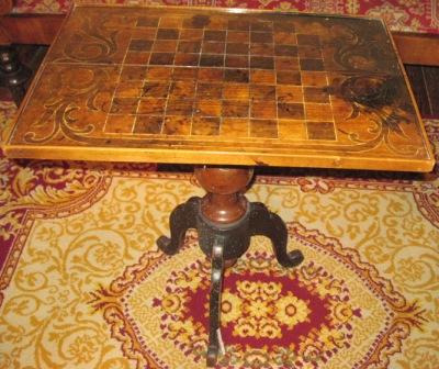 Mesa de xogos co taboleiro do xadrez debuxado e nos extremos motivos vexetais de roleos, que se sostén nun soporte central rematado en tres pequenas patas avolutadas.