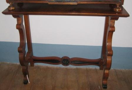 Mesa tipo buffet que serve de soporte ao bargueño. En madeira de catro pés de lira, de perfil avolutado en forma de C os dianteiros, e unidos cunha cabia inferior tallada en forma de flor pintada en negro.