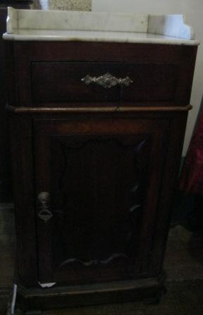 Mesa de noite en madeira de castiñeiro, coas súas esquinas cortadas en chafrán. Porta no frontal resalteada cun cadrón: dá paso á lacena interior, que conta cun estante e caixón. Repisa en mármore gris veteado con antepeito no fondo.