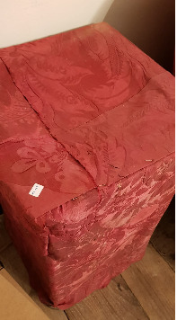 Peaña baixa de planta cadrangular en madeira de castiñeiro con repisa voada perfilada cun filete e pé de antepeito sobre arco moi apaisado. Nun dos laterais, debuxado a plumilla por D. Benxamín de Prado, o escudo de armas do apelido Taboada-Zuñiga.